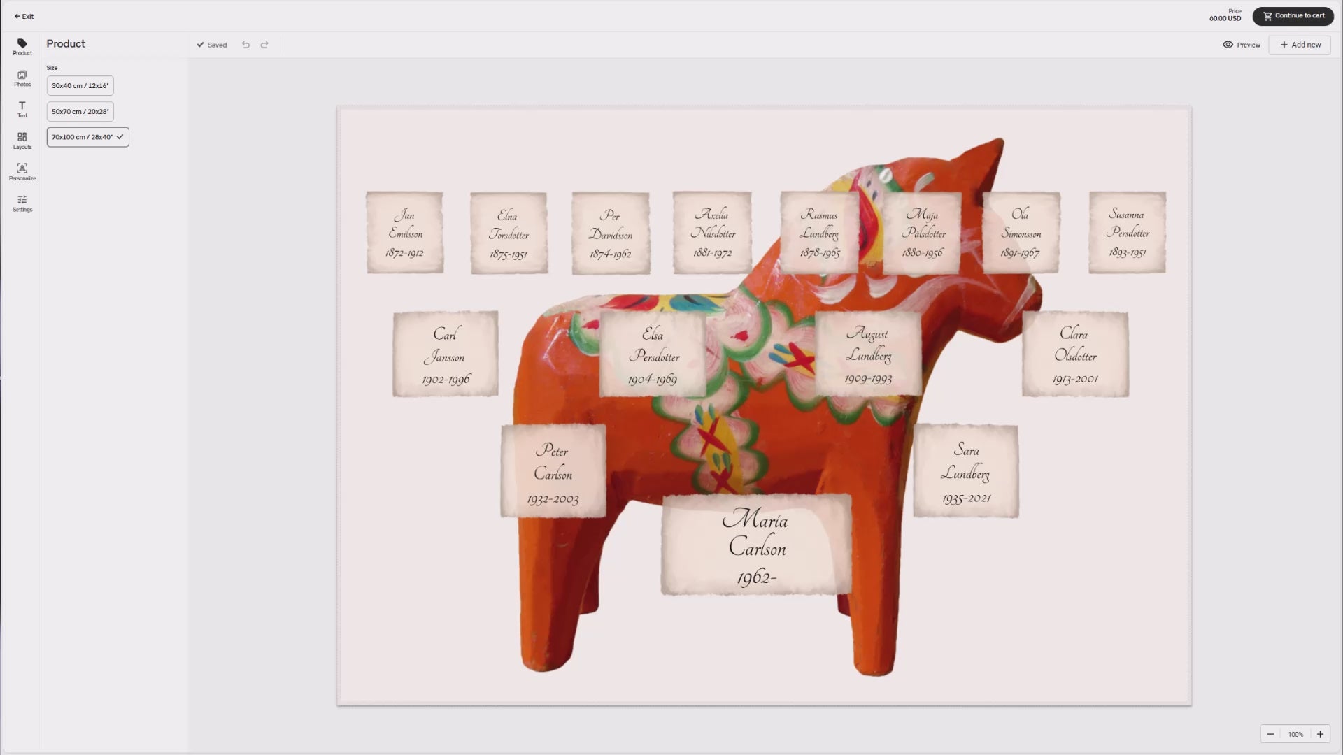 In the first video below, we walk you through how to select and customize a family tree by adding names, details, and a background of your choice. The second video shows how to add your own images and text to the family tree.